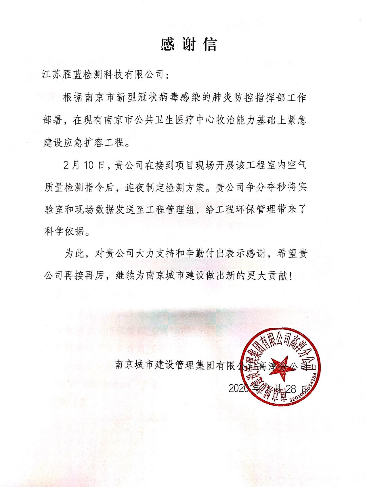 面對突發(fā)的新冠疫情,根據(jù)市疫情防控指揮部部署,在南京新冠肺炎收治點緊急擴建南京版“火神山”,并委派江蘇雁藍馳援該工程的環(huán)境檢測工作。接到指令后,我公司6小時內(nèi)組建完成專項工作組并完成檢測方案上報,技術人員在一線連續(xù)奮戰(zhàn)4個晝夜完成全部檢測工作,為指揮部提供全面的檢測數(shù)據(jù)和分析結果。